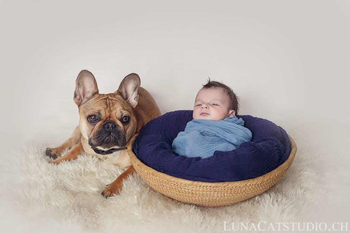 Léo was accompanied by his parents (of course) for his newborn photo shoot, but also by his lovely dog Zola, who is also a young baby as she is only 1 year old. These two will spend incredible moments playing together later on! One thing was for sure, Zola was loving every part of this photo shooting as she was really playful! Yet, she was behaving greatly for this first picture and Léo’s parents had trained her well in this regard.