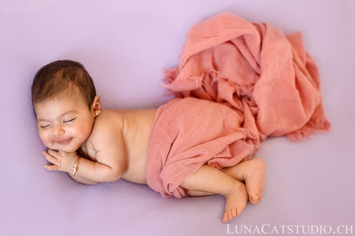 Il vaut mieux réaliser le shooting photo bébé dans les premiers jours après la naissance de bébé pour une séance photo nouveau-né optimale. Mais il existe des cas qui font que, même réservée à l’avance, la séance photo nouveau-né se fait plus tardivement que ce qu’on voudrait. Dans le cas de Monira, c’est à 6 semaines après sa naissance que j’ai fait sa connaissance, tout simplement car ses parents étaient en vacances à Montreux sur la Riviera vaudoise. Dans le titre, j’ai bien indiqué shooting photo bébé 1 mois mais c’est bien un shooting photo bébé 1 mois et demi mais ça commençait à faire très long ;). A partir d’un mois, votre bébé dort beaucoup moins (c’est déjà le cas dès 15 jours pour être précise) et cela donne moins de latitude au niveau des poses pour le shooting photo, c’est pourquoi la séance photo nouveau-né est adaptée à partir d’un mois selon votre bébé mais les poses seront moins évoluées et moins simples à réaliser.